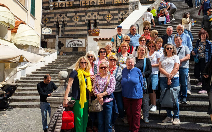 Ein traumhaft sonniger Tag begann mit einem kurzen Stopp bei der Limoncello-Manufaktur „Limoncello di Capri“. Gut gelaunt und mit zitronengelben Flaschen im Gepäck starteten wir unsere abenteuerliche Fahrt entlang der spektakulären „Costiera Amalfitana“. Unser Busfahrer Antonio brachte uns sicher in die charmante Stadt Amalfi. Dort erwartete uns im Lokal „di Chiostro“, direkt neben dem Kreuzgang der Kathedrale, ein kulinarisches Highlight: Tagliatelle mit Zitronensauce – einfach himmlisch!