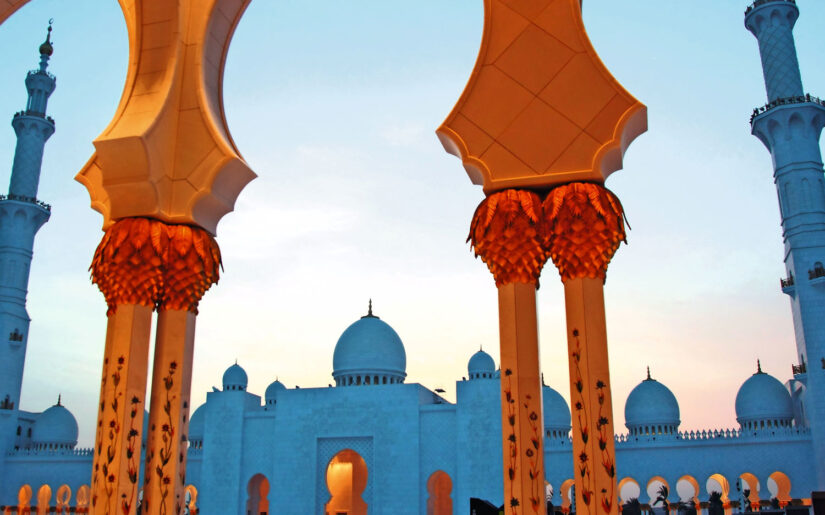 Heute steht die Hauptstadt Abu Dhabi auf dem Programm. Nach dem Frühstück fahren wir zu unserem ersten Stopp – zu der Scheich Zayid Moschee. Schon von weitem sieht man die imposante weiß-goldene Moschee inmitten von Abu Dhabi stehen. Die Moschee birgt viele Highlights in sich, wie die bunten Blumenverzierungen auf dem weißen Mamor, den größten (Swarovski-) Kronleuchter der Welt, den größten Teppich der Welt und vieles mehr.
