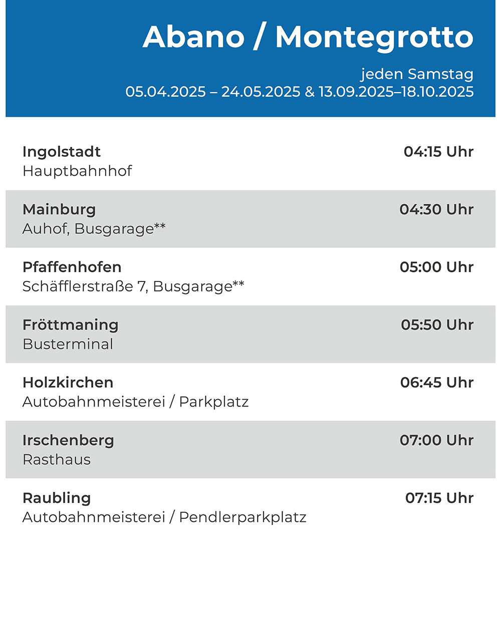 Die Verfügbarkeit der genannten Produkte kann variieren. Eine vollständige Liste aller Allergene und Zusatzstoffe unseres Bordservices liegt bei der Stanglmeier-Reisebegleitung zur Einsicht bereit.