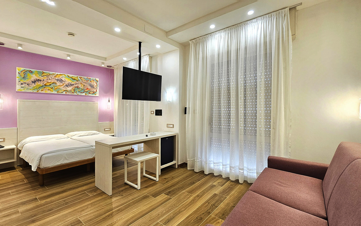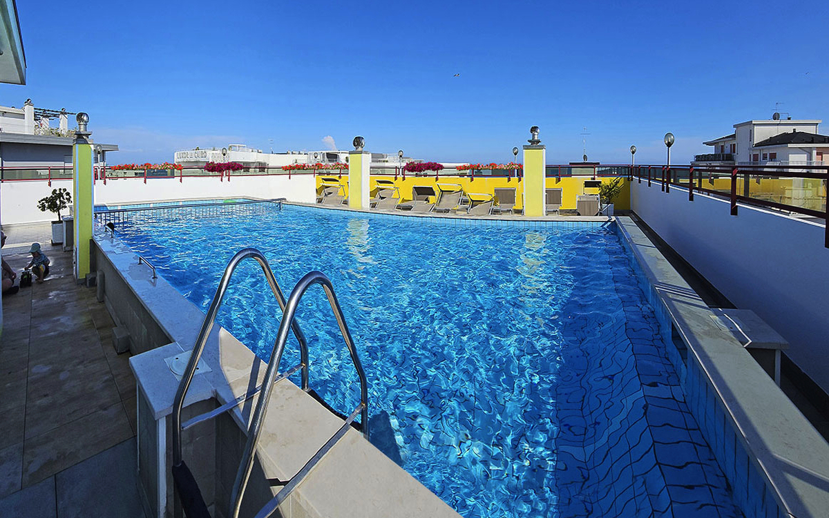Das gepflegte 3-Sterne-Hotel befindet sich nur etwa 50 Meter vom privaten Strand entfernt und liegt in unmittelbarer Nähe zur Piazza Nember, die sich abends in eine lebhafte Fußgängerzone mit Geschäften, Bars und mediterranem Flair verwandelt. Der belebte Piazza Aurora liegt 15 Geminuten vom Hotel entfernt - perfekt für einen abendlichen Spaziergang.