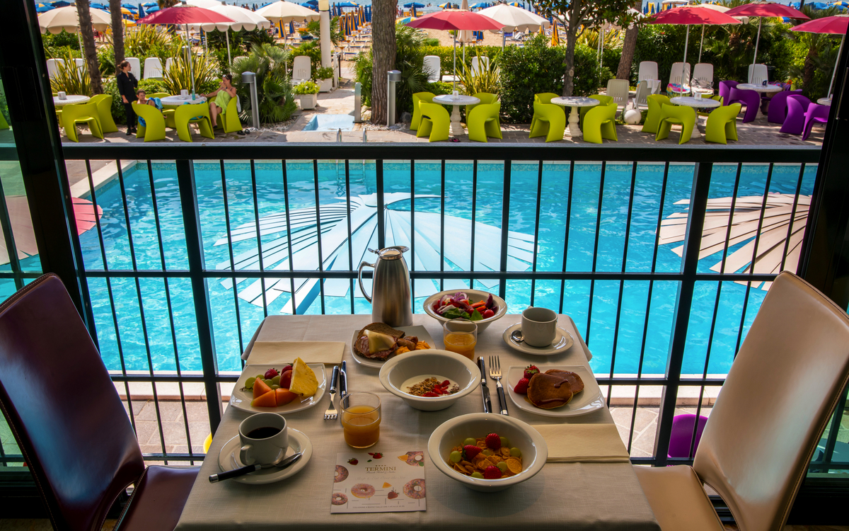 Im Termini Beach Hotel & Suites genießen Sie täglich ein reichhaltiges Frühstücksbuffet in entspannter Atmosphäre – im lichtdurchfluteten Restaurant mit teilweise Meerblick und großer Auswahl an frischen Produkten wie Obst, Eiern, Aufschnitt, süßen Backwaren und regionalen Spezialitäten. Besonders praktisch: Das Buffet für Langschläfer ist bis 10:30 Uhr geöffnet. Mittags erwartet Sie ein kostenloses Nudelgericht mit Cremesuppe auf der Poolterrasse – ideal für eine leichte Mahlzeit zwischen Schwimmbad und Strand. Da im Hotel keine Halbpension angeboten wird, greifen Gäste gerne auf die Poolbar zurück: Hier gibt es leckere Snacks, Salate, Sandwiches, Caprese, Fisch- und Nudelgerichte sowie Desserts. Das hoteleigene Restaurant „Il Gatto che ride“, direkt gegenüber dem Hotel, erwartet Sie ab 17 Uhr mit einem Rabatt von 10 %. Reservierungen können bequem an der Rezeption vorgenommen werden.