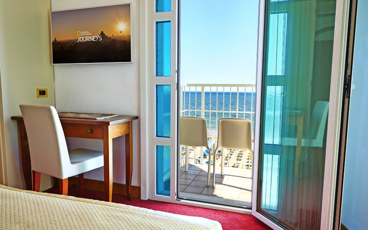 Das Hotel ist perfekt ausgestattet, um Ihnen einen erholsamen und komfortablen Urlaub zu bieten. Sie finden einen herrlichen Pool (NEU in 2026: Ganzjährig beheizt) mit Stufen für einen bequemen Einstieg, eine Meerblick-Terrasse mit Liegen und Sonnenschirmen sowie einen reservierten Bereich am Strand, ebenfalls mit Liegen und Sonnenschirmen die im Reisepreis bereits inklusive sind. Fahrräder und Nordic-Walking Stöcke stehen Ihnen kostenlos zur Verfügung, um die Umgebung zu erkunden. Die Terrasse im 7. Stock bietet Ihnen, dank eines Panoramablicks durch ein Fernglas, eine atemberaubende Aussicht. Am Pool können Sie einen köstlichen Cappuccino, erfrischende Biere oder leckere Eisbecher genießen. Das Hotel bietet kostenfreies WLAN, eine Leseecke und einen 85''-TV zu Ihrer Unterhaltung. Für die kleinen Gäste gibt es einen eigenen Spielbereich. Das Termini Beach Hotel & Suites bietet verschiedene Zimmerkategorien, die alle geschmackvoll eingerichtet sind und modernen Komfort für einen entspannten Aufenthalt garantieren. Ab 2026 sind alle Zimmer frei von Teppichböden. Die Classic Doppelzimmer (ca. 15 m²) verfügen über einen privaten Balkon mit Blick auf den Pool oder seitlichen Meerblick. Zur weiteren Ausstattung gehören eine Klimaanlage/Heizung, ein Flachbild-SAT-TV, Safe, ein Telefon, ein Schreibtisch, kostenfreies WLAN sowie ein Bad mit Dusche oder Badewanne, Bidet, Pflegeprodukten und einem Föhn. Für Gäste, die Wert auf eine besondere Aussicht legen, bieten die Doppelzimmer Superior Adria mit direktem Meerblick (ca. 17 m²) zusätzlichen Raum und einen Balkon mit freiem Blick auf die Adria – bei gleicher komfortabler Ausstattung. Die Comfort-Dreibettzimmer (ebenfalls ca. 17 m²) sind ideal für Familien oder kleine Gruppen geeignet. Sie verfügen über ein zusätzliches Bett oder ein Schlafsofa und bieten ebenfalls einen seitlichen oder teilweisen Meerblick sowie einen möblierten Balkon. Auch hier zählen SAT-TV, Safe, Klimaanlage, Minibar oder Minikühlschrank, Telefon und ein gut ausgestattetes Bad zur Standardausstattung. Ergänzend gibt es – je nach Saison und Verfügbarkeit – Superior- oder Deluxe-Zimmer sowie Junior-Suiten und Familienzimmer, die mit noch mehr Platz, gehobener Ausstattung und teilweise exklusivem Meerblick überzeugen. Alle Zimmer sind bequem per Aufzug erreichbar und bieten ein elegantes, modernes Ambiente für einen erholsamen Aufenthalt in direkter Strandlage.