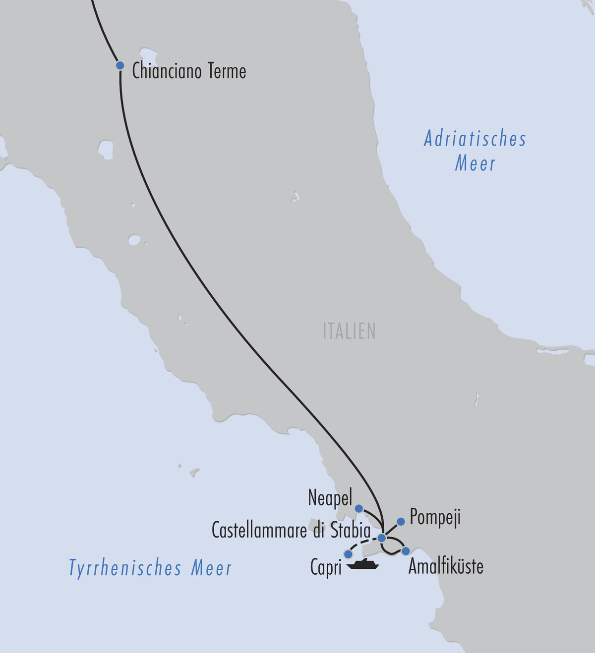Durch die bayerische Voralpenlandschaft und über die Alpen reisen auf einer panoramareichen Fahrt in die Region Chianciano Terme in der wunderschönen südlichen Toskana, eine traditionsreiche Kurregion umgeben von sanften Hügeln, Zypressen und Weinbergen. Zwischenübernachtung. Nach dem Frühstück am 2. Tag setzen Sie Ihre Reise weiter in Richtung Süden fort. Sie erreichen die Region Kampanien am berühmten Golf von Neapel. Ihr Ziel ist Castellammare di Stabia, ein lebendiger Ort mit eleganter Uferpromenade, direkt zwischen Neapel und dem legendären Sorrent gelegen. Ihr Hotel liegt einen kurzen Spaziergang von der Uferpromenade und dem Bahnhof der Ferrovia Circumvesuviana entfernt, die Sie z. B. nach Neapel oder in das legendäre Sorrento bringt. Mit Blick auf den Vesuv und das Tyrrhenische Meer beginnt hier Ihr Aufenthalt in einer der faszinierendsten Regionen Italiens!
