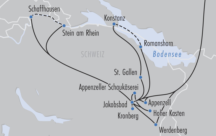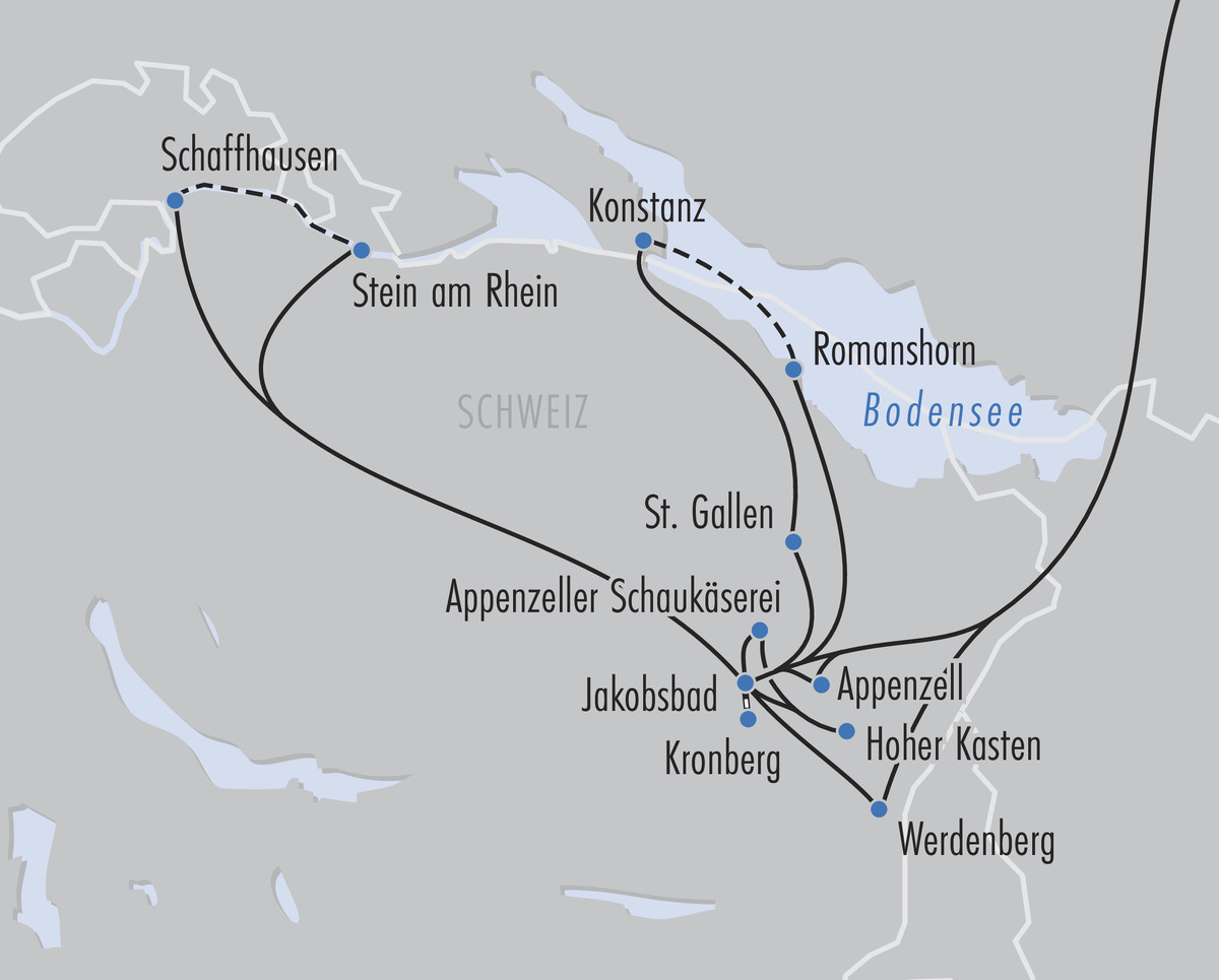 • Stanglmeier-Erlebnisprogramm inkl. 5 Erlebnistagen: Grüezi Appenzell (Dorfrundgang Appenzell mit Reiseleitung), Bodenseepanoramen (Stadtspaziergang St. Gallen inkl. Besuch Stiftsbibliothek, Aufenthalt Konstanz & Bodensee-Schifffahrt Konstanz-Romanshorn), Hoch hinaus (Berg-/Talfahrt Kronberg, Besuch Appenzeller Schaukäserei Stein inkl. Verkostung & Berg-/Talfahrt Hoher Kasten), Wassergewalten (Rheinfall-Schifffahrt, Aufenthalt Schaffhausen, Rhein-Schifffahrt Schaffhausen-Stein am Rhein & Stadtspaziergang mit Reiseleitung Stein am Rhein) & Landpartie (Panoramafahrt Appenzeller Land inkl. Aufenthalt Werdenberg)