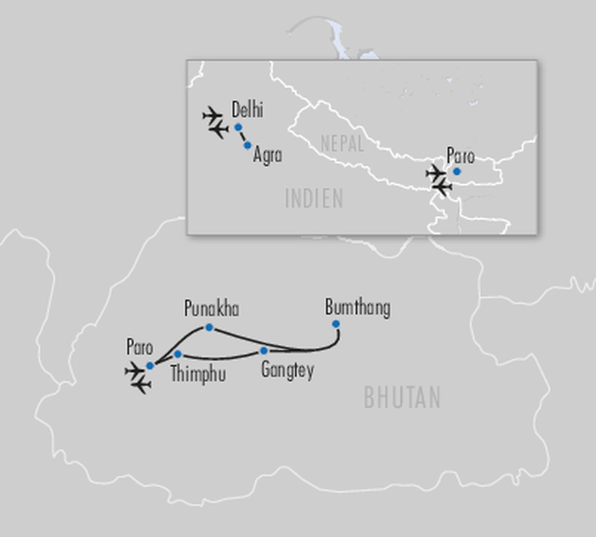 • Stanglmeier-Erlebnisprogramm inkl. 12 Erlebnistagen mit Reiseleitung: Liebesdenkmal (Zugfahrt Delhi-Agra-Delhi, Besuch Taj Mahal & Besuch Agra Fort), Kuzuzangpola (Thimphu: Trashichho Dzong), Königliche Hauptstadt (Thimphu: Buddha Dordenma, Gagyel Lhundrup Weaving Centre, Memorial Chorten, Zorig Chusum, Nationalbibliothek & Papierfabrik), Hoch hinaus (Dochula-Pass, Wangduephodrang, Pele La Pass & Gangtey Kloster), Spuren der Natur (Wanderung Gangtey Nature Trail & Crane Information Centre), Täler und Pässe (Pele La-Pass, Chendebji Chorten, Trongsa Dzong, Yotong-La Pass, Chumey-Tal & Weberei), Tal der Klöster (Bumthang: Wanderung Three Temples-Valley Walk, Kloster Jambay Lhakhang, Bauernhof, Kloster Kurjey Lhakhang, Brauerei & Käserei), Göttlicher Narr (Royal Heritage Museum & Kloster Chimi Lhakhang), Flussgenuss (Wanderung Kloster Khamsum Yuelley Namgyal Chorten & Punakha Dzong), Zeitreise (Dochula-Pass & Paro: Nationalmuseum & Tempel Kyichu Lhakhang), Tigernest (Paro: Kloster Taktsang & Besuch bei einer Bauernfamilie) & Namaskar (Stadtbesichtigung Delhi)