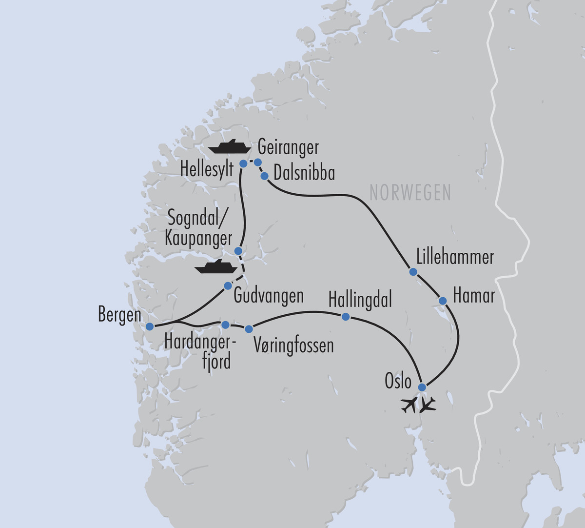 • 6x Übernachtung mit Halbpension in Rundreisehotels (z. B. Scandic Hamar, Havila Geiranger, Quality Sogndal, 2x Heimen Bergen & Storefjell Hallingdal – oder vergleichbar)