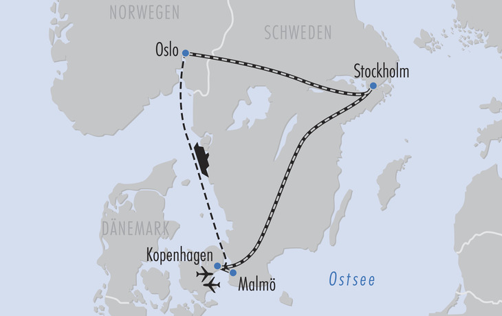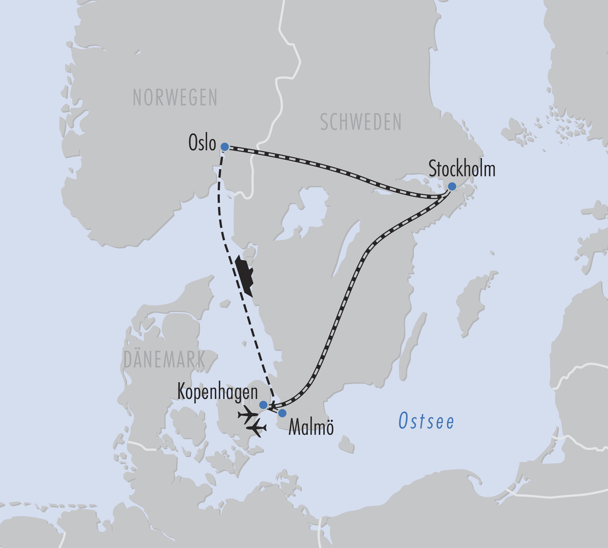 Entdecken Sie die kulturelle Vielfalt und das nordische Flair der vier einzigartigen Städte! Kopenhagen, Malmö, Stockholm und Oslo erwarten Sie mit ihrer ganz eigenen Mischung aus Tradition, Moderne und nordischem Charme. Bequem und klimafreundlich reisen Sie mit dem Zug durch Skandinavien und genießen zum Abschluss eine entspannte Minikreuzfahrt auf der Ostsee. Diese Reise bietet nicht nur spannende Stadterlebnisse, sondern führt Sie auf beeindruckende Bahnstrecken durch die wunderschöne Natur Skandinaviens!