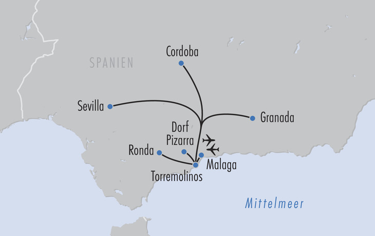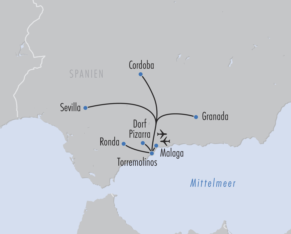 - Stanglmeier-Erlebnisprogramm inkl. 5 Erlebnistagen mit örtlicher Reiseleitung: Bienvenidos Andalucía (Stadtbesichtigung in Málaga), Maurischer Zauber (Ausflug Granada inkl. Besuch Alhambra), Herz Andalusiens (Ausflug Córdoba inkl. Besuch Mezquita), Ciudad Capital (Ausflug Sevilla inkl. Besuch Alcázar) & Zitrustal (Ausflug Dorf Pizarra inkl. Orangen Finca mit Paella-Mittagessen mit Rot-/Weißwein/Wasser/Bier/Softdrinks)