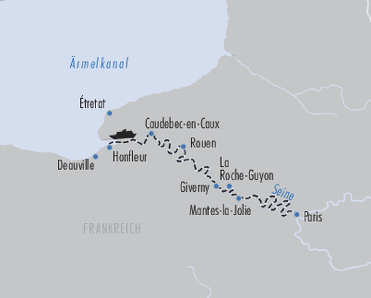 Wenn sich die Seine in sanften Windungen durch das Herz Frankreichs schlängelt, beginnt eine Reise voller Eleganz, Kultur und unvergesslicher Eindrücke. Von der pulsierenden Metropole Paris bis zur malerischen Küste der Normandie entfaltet sich eine Landschaft, die seit Jahrhunderten Künstler, Genießer und Reisende gleichermaßen inspiriert. Ihre Flusskreuzfahrt führt Sie vorbei an charmanten Städtchen, beeindruckenden Schlössern und den berühmten Schauplätzen des Impressionismus. Entdecken Sie historische Orte, genießen Sie die französische Lebensart und lassen Sie sich von der abwechslungsreichen Natur entlang der Seine verzaubern. Freuen Sie sich auf eine genussvolle Reise zwischen Großstadtflair und maritimer Atmosphäre – von Paris bis nach Honfleur, wo die Seine schließlich auf das Meer trifft.