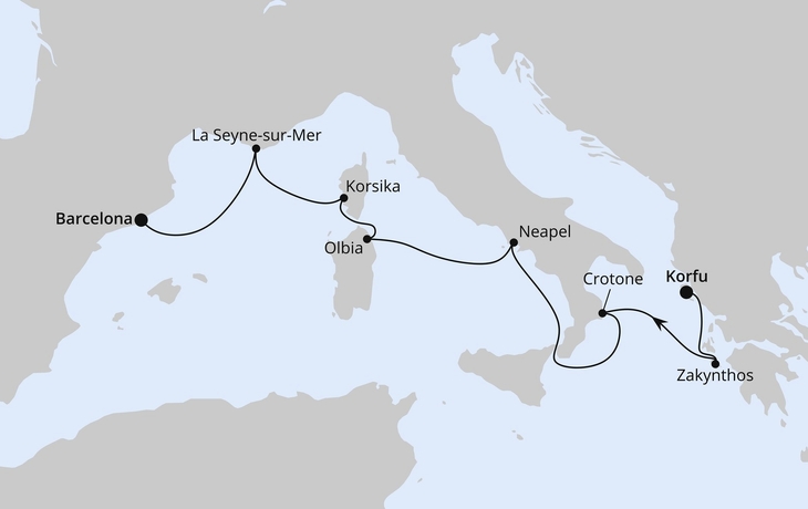 Entdecken Sie in kürzester Zeit zahlreiche der schönsten Städte entlang traumhafter Küstenlandschaften des Mittelmeers. Es verzaubert die malerische Naturvielfalt, endlose Sandstrände, himmelblaues Meer, paradiesische Einbuchtungen, die zum Baden einladen, gigantische Vulkangesteine und die mannigfaltigen Mentalitäten der abendländischen Kultur. Wunderschöne Städte wie Palma de Mallorca, Malta, Neapel, Rom, Cannes, Nizza und Saint-Tropes verzaubern mit fesselnder Geschichte und bezaubernder Atmosphäre vor einmaligen Kulissen. Freuen Sie sich auf köstliche Spezialitäten und Getränke. Eine Kreuzfahrt auf dem Mittelmeer lässt das Herz von allen Reisebegeisterten und unterschiedlichen Reisetypen höher schlagen.